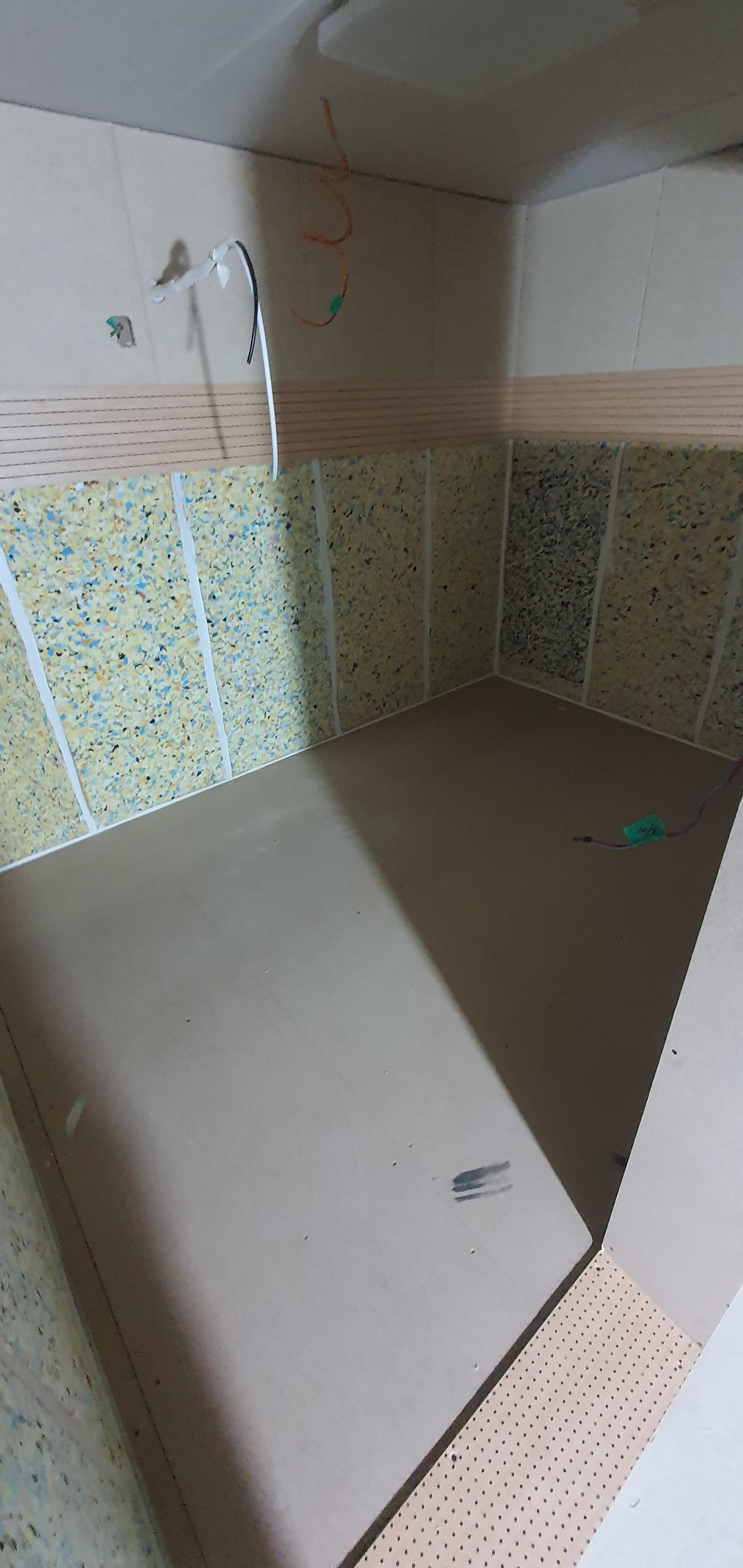 단열재를 깔고 바닥사이즈에 맞게 필름을 재단후 바닥에 고정시켜줍니다